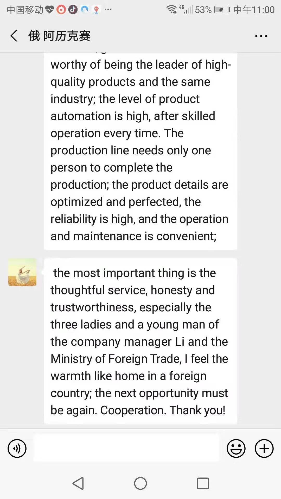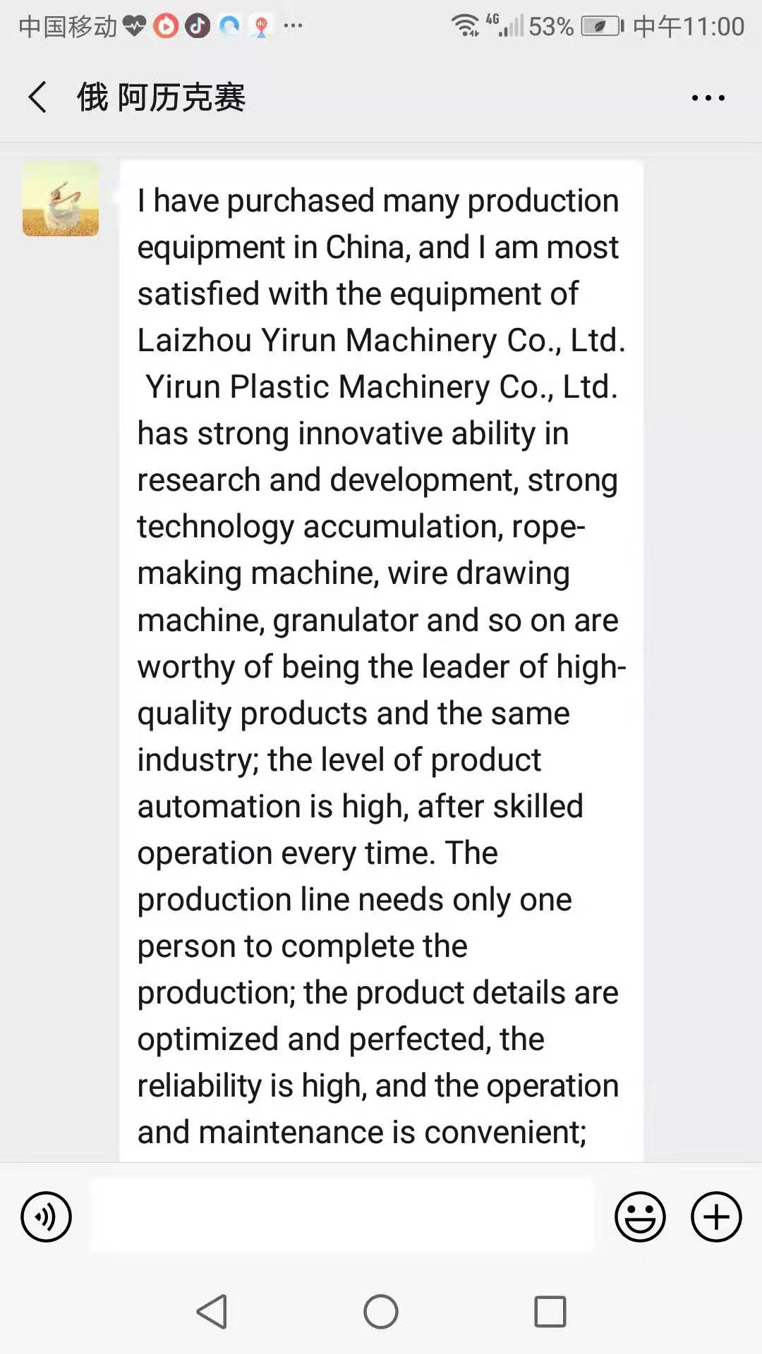 俄羅斯客商說:我在中國購買了多次生產(chǎn)設備,滿意萊州市一潤機械有限公司的設備,一潤公司塑料機械研發(fā)創(chuàng)新能力強,技術積累雄厚,制繩機、拉絲機、造粒機等不愧是優(yōu)質產(chǎn)品和同行業(yè)的領先者;產(chǎn)品自動化水平高,熟練操作之后每條生產(chǎn)線只需1人即可完成生產(chǎn);產(chǎn)品細節(jié)優(yōu)化完善、可靠性高,方便操作維護;主要的是服務周到、誠實守信,特別是公司李經(jīng)理和外貿(mào)部的三位女士和一位小伙是我感受到了在異國如同家一般的溫暖;下次有機會必定再次合作。謝謝!